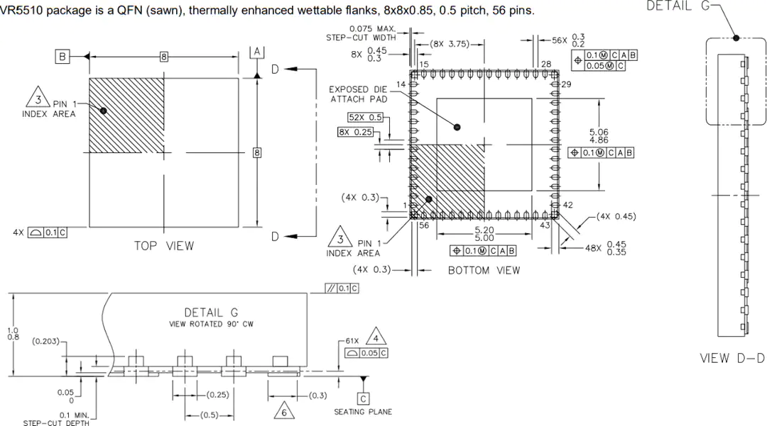 VR551如果提供在QFN56包与热增强可湿性侧面。具有可湿式侧翼的器件可以实现自动光学检测(AOI),具有更大的抗剪切力,并能处理PCB弯曲,从而提高可靠性。