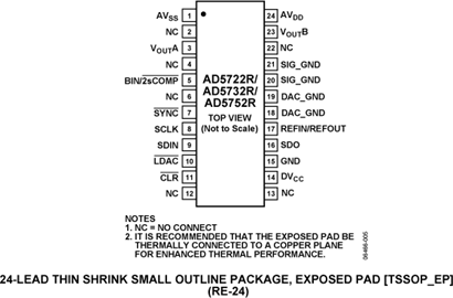 AD5722R/AD5732R/AD5752R采用串行接口,能够以最高30 MHz的时钟速率工作,并且与DSP和微控制器接口标准兼容。利用双缓冲,DAC可实现同时更新。对于双极性输出,输入编码方式为用户可选的二进制补码或偏移二进制(取决于BIN/2sComp引脚的状态);对于单极性输出,输入编码方式为标准二进制。利用异步清零功能,可将DAC寄存器清零至用户可选的零电平或中量程输出。这些器件均采用24引脚TSSOP封装,额定温度范围为-40°C至+85°C工业温度范围。