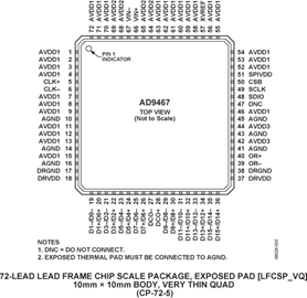 AD9467采用72引脚LFCSP无铅封装,额定温度范围为-40°C至+85°C工业温度范围。