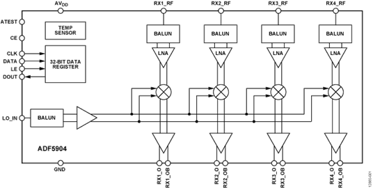 ADF5904是一款4通道、24 GHz接收机下变频器。 每个通道包含一个集成片内巴伦的单端RF输入,后接差分低噪声放大器(LNA),以及集成差分输出缓冲器的下变频混频器。 RF LO路径还有片内巴伦。