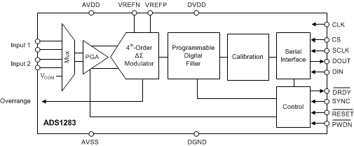 此转换器使用一个固有稳定性的四阶 得尔塔-西格马 调制器来获得出色的抗噪性能和线性性能。调制器数字输出由片上数字滤波器进行数字过滤和抽取,以生成 ADC 转换结果。