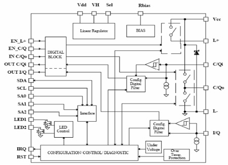 (2)C进行通信。L6360通过9个寄存器来管理可编程参数及IC状态。监测的故障条件包括:L+ 线、过温、C/Q过载、线性稳压器欠压、以及奇偶校验。内部LED驱动器电路采用漏极开路配置,并提供两个可编程序列来驱动两个LED。