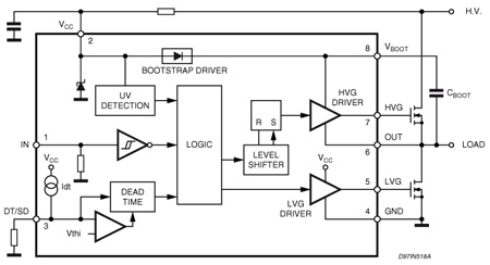 L6384E是一种高压栅极驱动器,采用BCD “离线”技术制造,能够驱动半桥功率MOSFET或IGBT器件。高侧(浮动)部分能够工作电压轨高达600v。由于单输入配置,两个器件输出可以分别吸收650 mA和400 mA,不能同时驱动高。死时间功能保证了进一步防止输出交叉传导,用户可通过外部resi或连接到DT/SD引脚进行调节。L6384E器件有一个输入引脚,一个使能引脚(DT/SD)和两个输出引脚,并保证了低端和高端之间匹配的延迟,从而简化了器件的高频操作。逻辑输入是CMOS/TTL兼容,以方便与控制设备的接口。引导rap二极管集成在设备内,允许更紧凑和可靠的解决方案。
