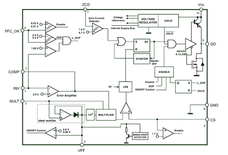 图腾柱输出时代,能够600 mA的源和800 mA的吸收电流,适用于高功率MOSFET或IGBT驱动器。结合其他特性和专有的固定开关时间控制的可能性,使该设备成为SMPS高达400w的优秀解决方案,这需要符合EN61000-3-2和JEITA-MITI标准。