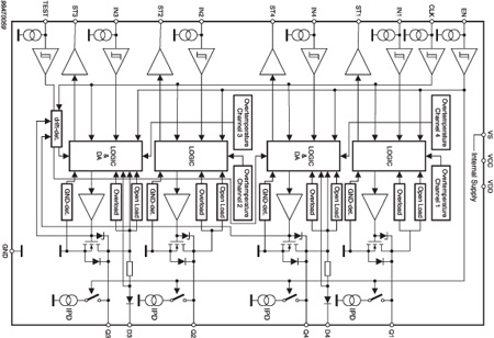 所有四个通道都被监控与一个状态输出。所有连接到设备负载和电源引脚的接线都被控制。设备在输出处再次发生短路和过温自保护。对于每个通道,一个独立的推拉状态输出用于并行诊断功能。