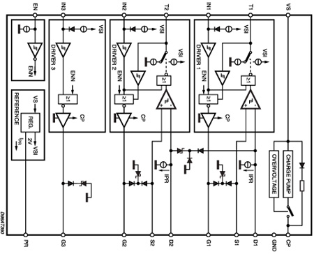 L9380器件是一个控制器,用于三个外部n通道功率MOS晶体管在“高侧开关”配置。它适用于汽车电气控制单元中的继电器更换。