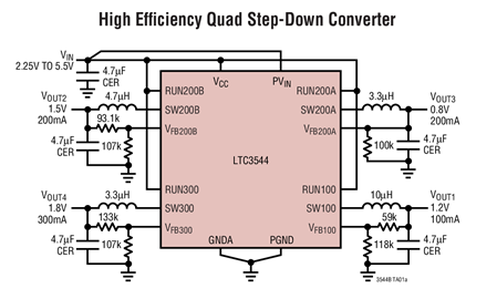 凌力尔特公司(Linear)推出4通道、高效率、2.25MHz、同步降压型稳压器LTC3544,该器件采用3mmx3mmQFN封装,提供高达300mA、双200mA和100mA的连续输出电流。LTC3544采用恒定频率电流模式架构,