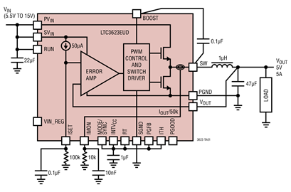 LTC 3623 是一款高效率、单片式、同步降压型稳压器,其输出电压利用单个外部电阻器进行设置。在 ISET 引脚上具有内部生成的 50μA 准确电流源,因而允许用户设置一个范围为 0V 至 V(IN) - 0.5V 的输出电压。另外,用户还能用一个外部电压电源直接驱动 ISET 引脚以设置转换器的 V(OUT)。V(OUT) 电压直接回馈至误差放大器,以被调节至 ISET 电压。SV(IN) 引脚的工作电源电压范围为 15V 到低至 4V,而 PV(IN) 引脚的电压范围则为 15V 到低至 1.5V,从而使其成为双锂离子电池和从一个 12V 或 5V 电压轨获取电源的合适之选。