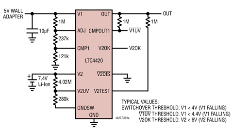 LTC 4420 是一款具有低工作电流的双输入单片式 PowerPath 优先级排序器,可在欠压和电源缺失的情况下为保持关键电路的有效运行提供后备切换。与二极管 “或” 产品不同,该器件从闲置电源吸收的电流极小,即使其电压高于工作电源也不例外。