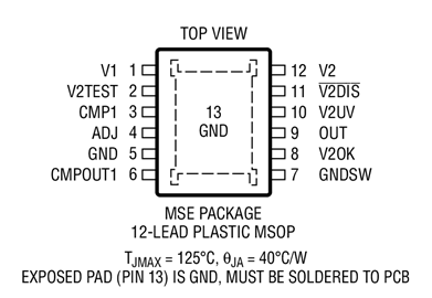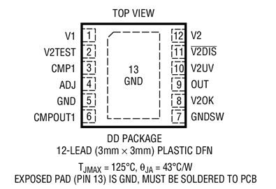 内部 2欧姆、电流限制 PMOS 开关提供从一个主输入 (V1) 或一个后备输入 (V2) 至输出的电源通路选择。两个通过外部阻性分压器设定的可调电压监视器在设定 V1 至 V2 切换门限和 V2 欠压门限方面提供了灵活性。V1 被持续监视,而 V2 电源监视包括可控的低占空比欠压 (UV) 监视。当主输入 V1 下降时,ADJ 监视器输入使 OUT 切换至 V2。当 V2 下降时,则把它与 OUT 断接 (如果V2DIS为低电平)。快速非重叠切换电路负责防止发生反向和交叉传导,同时尽量减小输出压降。