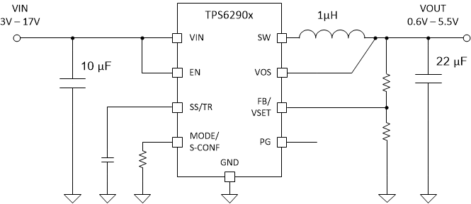 TPS62903可在轻负载时自动进入省电模式(如果选择自动PFM/PWM),以保持高效率。此外,为了在非常小的负载下提供高效率,该设备具有4µa的低典型静态电流。AEE,如果启用,提供高效率的V(IN), V(OUT)和负载电流。设备包括MODE/Smart-CONF输入,用于设置内部/外部分压器、开关频率、输出电压放电和自动省电模式或强制PWM操作。