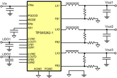TPS65262-1 内置两个低压降线性稳压器 (LDO),它们的输入电压范围为 1.3V 至 5.5V,持续输出电流为 350/150mA,具有独立使能和可调输出电压特性。