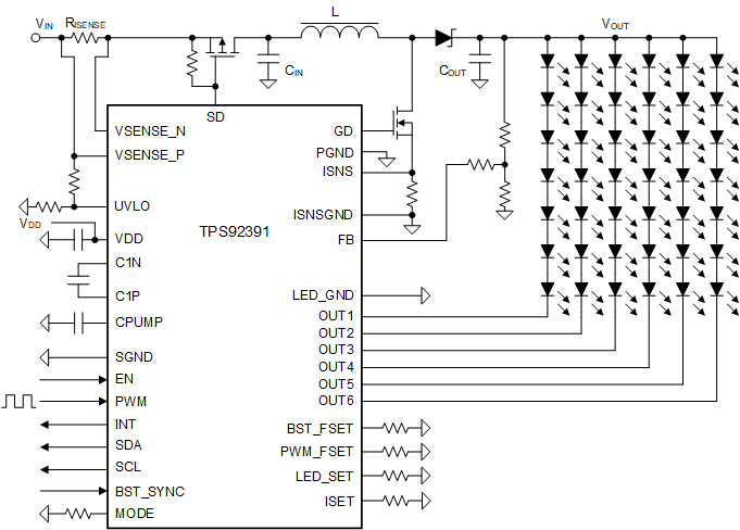 TPS92391是一款具有升压控制器的自动高效LED驱动器。6个高精度电流汇聚器支持根据使用的通道数自动调整相移。LED亮度可以通过I²C接口或PWM输入进行全局控制。