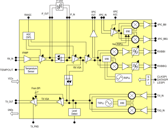 TRF2443是一款高度集成的全双工中频(IF)收发器,专为宽带点对点无线通信应用而设计。接收链集成了一个正交(IQ)解调器并提供超过90 dB的增益范围,通过模拟和数字控制的vga的组合获得。集成的可编程基带低通滤波器使TRF2443可以灵活地接收不同带宽的信号,同时也有助于在干扰信号到达ADC之前消除它们。此外,TRF2443还可以灵活地添加外部IF滤波器,以进一步消除不必要的信号。TRF2443发射机链集成了一个正交(IQ)调制器驱动一个高度线性中频DVGA,通过串行编程接口(SPI)提供35 dB的增益范围。TRF2443包括两个用于接收和发送链的合成器,消除了电路上对外部LO属的需要,并简化了频分双工(FDD)收发器设计的实现。TRF2443还通过集成的XPIC输出放大器和接收器链提供交叉极化干扰消除(XPIC)支持。TRF2443是实现中频收发器功能的理想构件,它通过同轴电缆接口连接到室内机(ODU),是点对点微波返程分体结构系统。