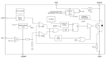 支持反激变换器、buck变换器和buck boo变换器的设计。集成的高压artup,感测场效应晶体管,误差放大器和抖动振荡器允许用最少数量的组件完成应用设计。