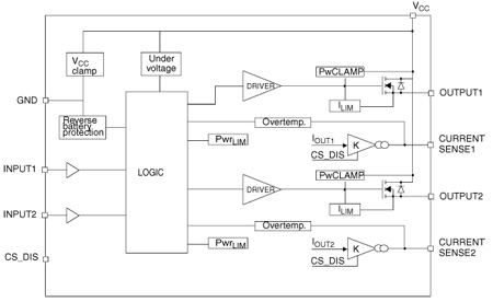 VND5004A-E和VND5004ASP30-E是利用微电子VIPower技术制作的器件。它们用于驱动一侧接地的电阻或电感负载。主动VCC引脚电压箝位和负载转储保护电路再次保护器件在VCC引脚上的瞬态。这些设备集成了一个模拟电流传感器,当CS_DIS被驱动低电平或左开时,该传感器提供与负载电流成比例的电流(根据已知的比例)。当CS_DIS被高驱动时,电流检测管脚是高阻抗的。输出电流限制保护设备在过载状态。在长时间过载的情况下,该设备将耗散的功率限制在一个安全水平,直到热关闭干预。热停机和自动重新启动使设备在故障状态消失后立即恢复正常运行。