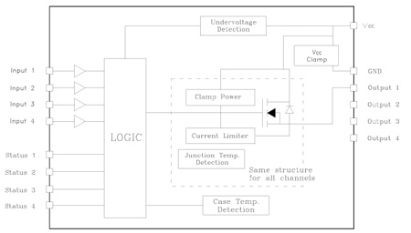 VNI4140K是一个使用微电子VIPower技术制作的单片器件,旨在驱动四个独立的电阻或电感负载,其中一侧连接到地。有功电流限制避免了在负载短路时系统电源下降。内置的热关机保护芯片免受过温和短路。在过载条件下,通道自动关断和回开,以保持TTSD和TR之间的结温。如果此条件使机箱温度达到TCSD,过载通道关闭,只有当机箱温度降低到TCR时才重新启动。当多个通道过载时,过载通道的重新设计不能同时进行,以避免来自电源的峰值电流。非过载通道继续正常运行。开漏诊断输出指示过温条件。