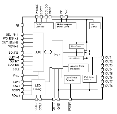 内部LED矩阵驱动电路(4行,2列)允许检测单个输出的状态。集成的降压稳压器为内部LED矩阵驱动器和逻辑输出缓冲器提供电源电压,如果应用需要隔离,可以用于提供外部光耦合器。该调节器通过一个峰值电流控制回路的脉冲逐脉冲电流限制来再次保护短路或过载条件。