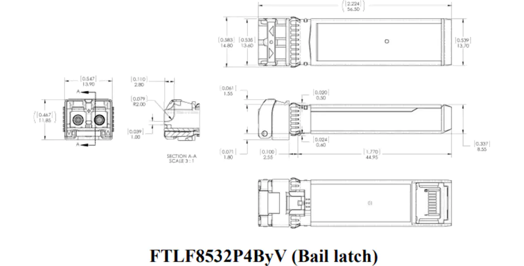 FTLF8532P5xxV收发模块包括一个增强的数字诊断监测接口,允许实时访问设备运行参数,如收发温度、激光偏置电流、发射光功率、接收光功率和收发电源电压。运行和诊断信息由收发器内部的DDTC (Digital diagnostics Transceiver Controller)监控和报告,DDTC通过2线制串行接口接入。