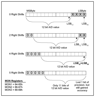 数字量输出前的最后一步操作是右移位。每一路MON输入均有3个控制位,用来控制右移次数。右移位的优势将在后面详细讨论。如果将此3位设为0,则禁止右移功能。与偏移一样,右移位也会影响满量程数字输出。例如,若将其设置成右移2位,则满量程数字输出变为3FFEh。移位完成后,数值随后被写入相应的寄存器中,从这里用户可以读取转换结果。这也是用来进行告警及警告比较的参数。