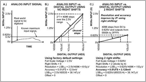 图2中,3条曲线以相同的y轴坐标并排排列,这样,对于输入信号上的某个特定点(图2A),通过一条通过该点及各传输函数的水平直线,可粗略地估计出数字输出。再回到本例的0V至0.5V输入信号,0.5V输入由一条穿过三条曲线的水平粗线标出,比较图B与C即可看出右移位的好处。该图非常直观地说明,当ADC输入范围远大于输入信号范围时,大量的量化台阶将被浪费掉(见图B)。4096个台阶中仅有819个被用到。图B中剩下的80%码字被浪费掉。与之相对比,曲线C则显示,通过在内部校准到一个较小的满量程电压,再运用右移位,精密度提高了。现在可用4096个码中的3276个码来对输入信号进行量化。更值得一提的是,经过右移后,所需的LSB量值没有改变。右移位操作对用户透明。通过观察这两条曲线上的输出近似为同一数字值即可证明这一点。