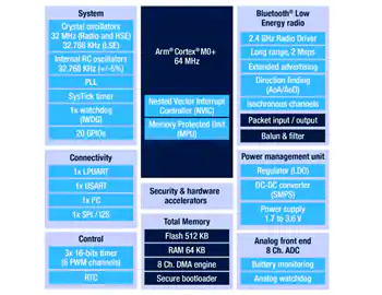 意法半导体STM32WB09 BLUETOOTH Low Energy 5.4 32位mcu集成了先进的2.4GHz无线ip,提供卓越的性能。主要特性包括RX灵敏度水平为-97dBm在1Mbps和-104dBm在125kbps(远程),可编程输出功率高达+8dBm,峰值电流为4.9mA TX和3.6mA RX。mcu符合蓝牙LE 5.4点对点和网状网络,适用于具有专有2.4GHz无线电通信的超低延迟应用,Arm Cortex -M0+微控制器工作频率高达64MHz, 512KB内部闪存具有丰富的外设,适用于成本敏感的应用。